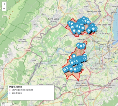 Objectif : Créer une carte vectorielle en positionnant correctement les arrêts de tram et bus uniquement sur les communes de Bernex et de Meyrin Données utilisées :