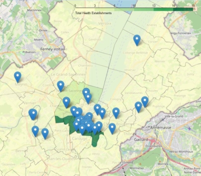 Objectif : Faire afficher une carte choroplèthe vectorielle (variations couleur selon une valeur) des communes genevoises ayant le plus d'établissements de santé (hôpital, clinique et autres) . Données utilisées :